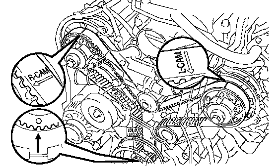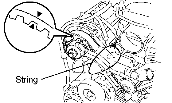To avoid meshing of the timing pulley and timing belt, secure one of them with string. And place matchmarks on the timing belt and RH camshaft timing pulley.