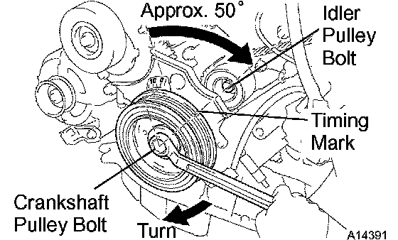c. Turn the crankshaft pulley approximately 50° clockwise, and align the timing mark of the crankshaft pulley with the centers of the crankshaft pulley bolt and the No.2 timing belt idler pulley bolt.