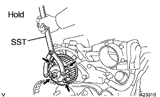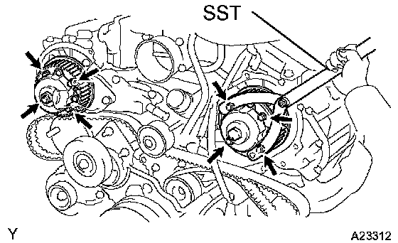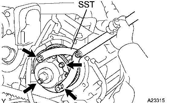 a. Hold the camshaft timing pulley with SST, loosen the 4 bolts of the timing pulley.