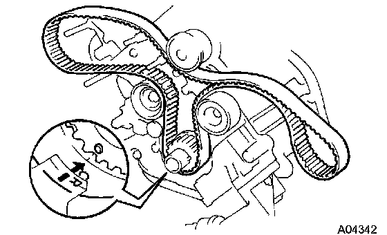 HINT: If re-using the belt and the installation mark has disappeared from it, place a new installation mark on the timing belt to the match the dot mark of the crankshaft timing pulley.