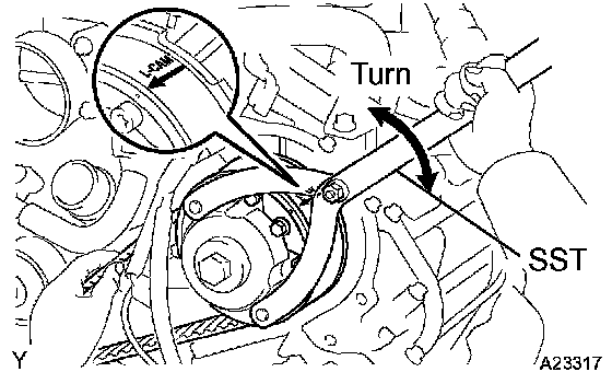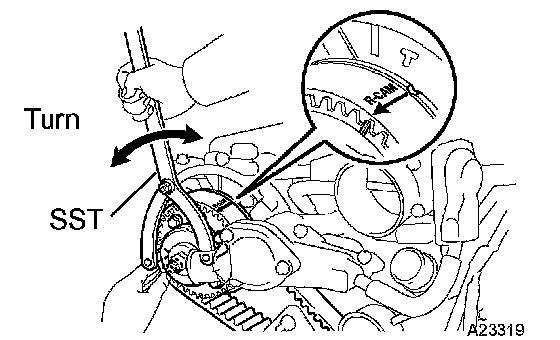 c. Using SST, turn the LH camshaft timing pulley counterclockwise until there is tension between the crankshaft timing pulley and LH camshaft timing pulley.