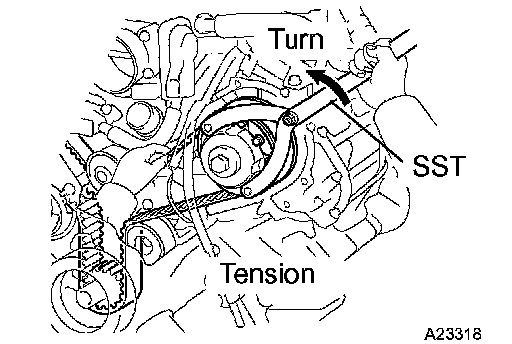 b. Using SST, turn the timing pulley. Align the installation mark on the timing belt with the timing mark of the timing pulley, and hang the timing belt on the timing pulley.