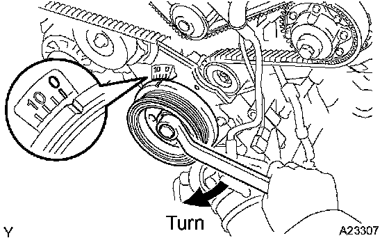 b. Slowly turn the crankshaft pulley 2 revolutions from the TDC to TDC.