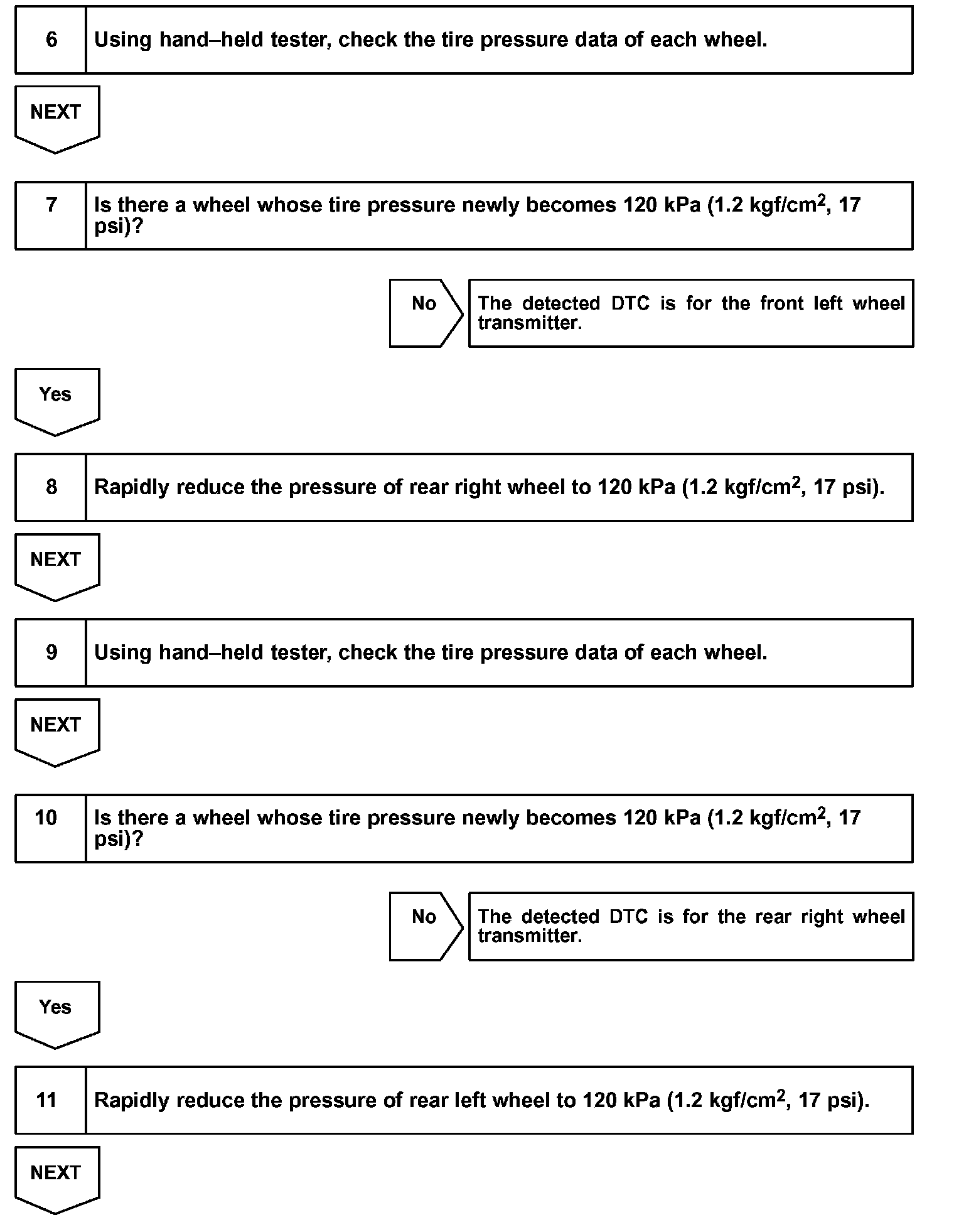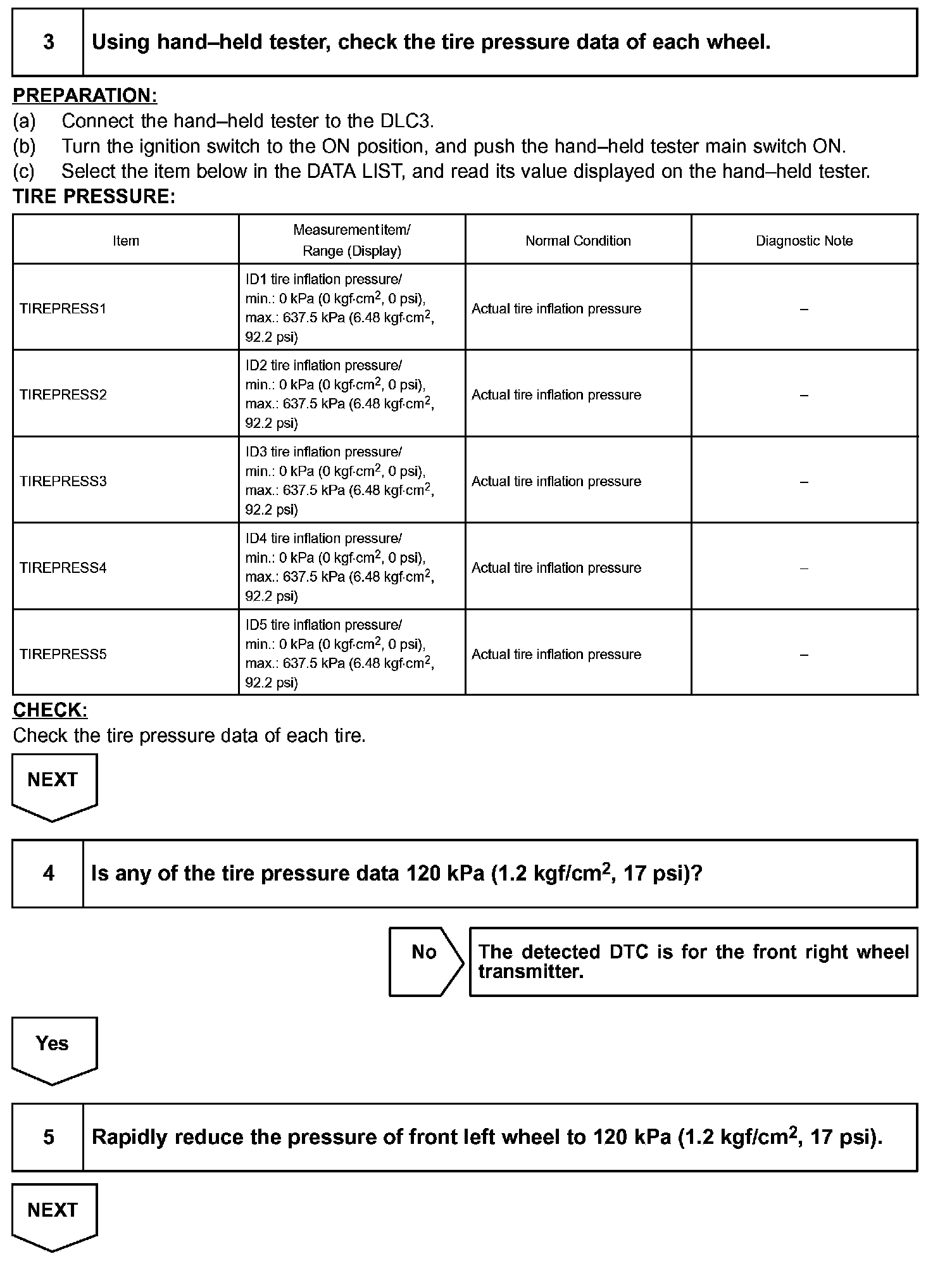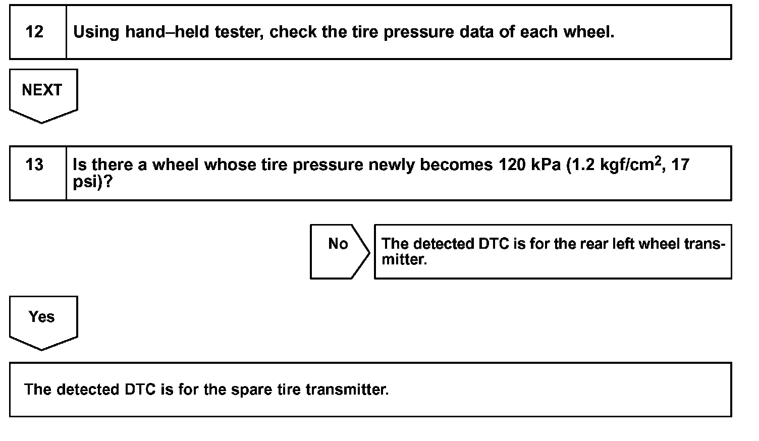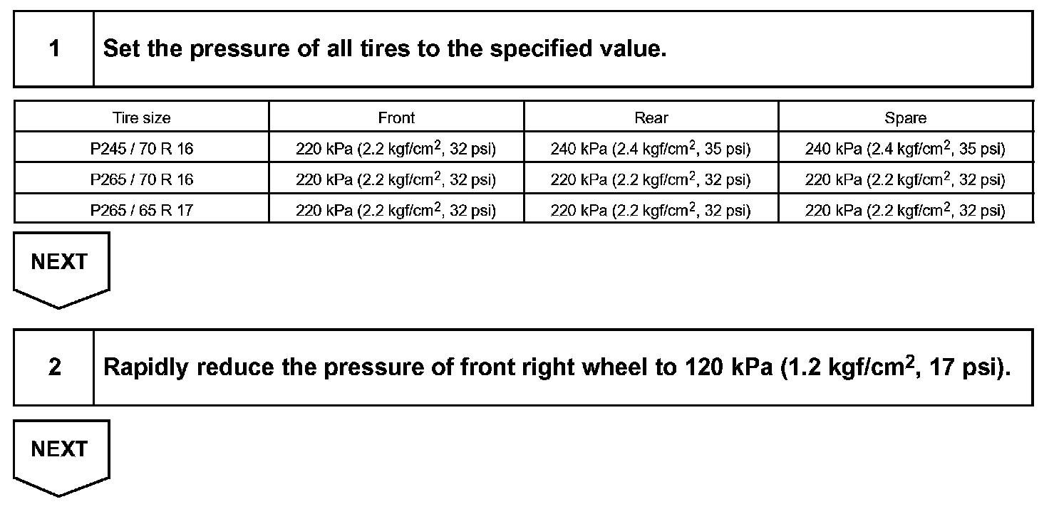 - DTCs relevant to the transmitters are corresponding to each transmitter ID. It is impossible to identify which tire is malfunctioning according to each transmitter ID. Therefore the following procedures must be followed to confirm the ID No. and tire location.