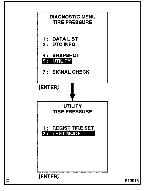 - During TEST MODE, the system is not initialized by pushing the tire pressure warning reset switch. The circuit of the tire pressure warning reset switch can be inspected during this mode.