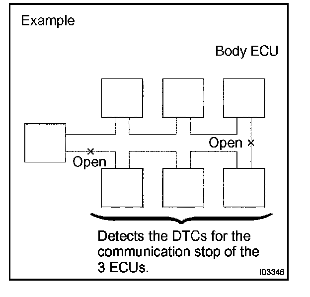 b. If 2 communication buses are open at the position shown in the illustration, DTCs for the ECU communication stop between these 2 buses are indicated.