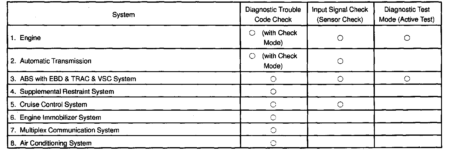 By using these check functions, the problem areas can be narrowed down quickly and troubleshooting can be performed effectively. Diagnostic functions are incorporated in the systems shown in the table in the SEQUOIA.