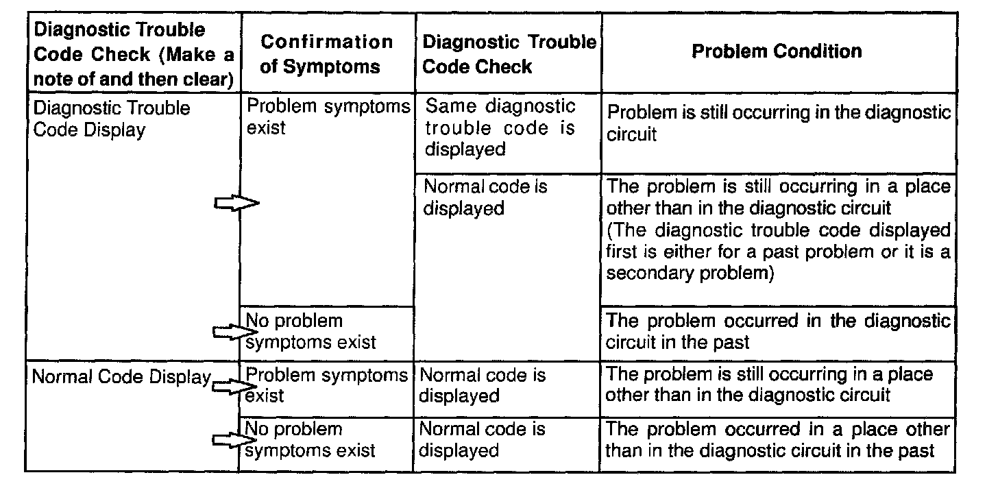 In diagnostic trouble code check, it is very important to determine whether the problem indicated by the diagnostic trouble code is still occurring or occurred in the past but returned to normal at present. In addition, it must be checked in the problem symptom check whether the malfunction indicated by the diagnostic trouble code is directly related to the problem symptom or not. For this reason, the diagnostic trouble codes should be checked before and after the symptom confirmation to determine the current conditions, as shown in the table. If this is not done, it may, depending on the case, result in unnecessary troubleshooting for normally operating systems, thus making it more difficult to locate the problem, or in repairs not pertinent to the problem. Therefore, always follow the procedure in correct order and perform the diagnostic trouble code check.