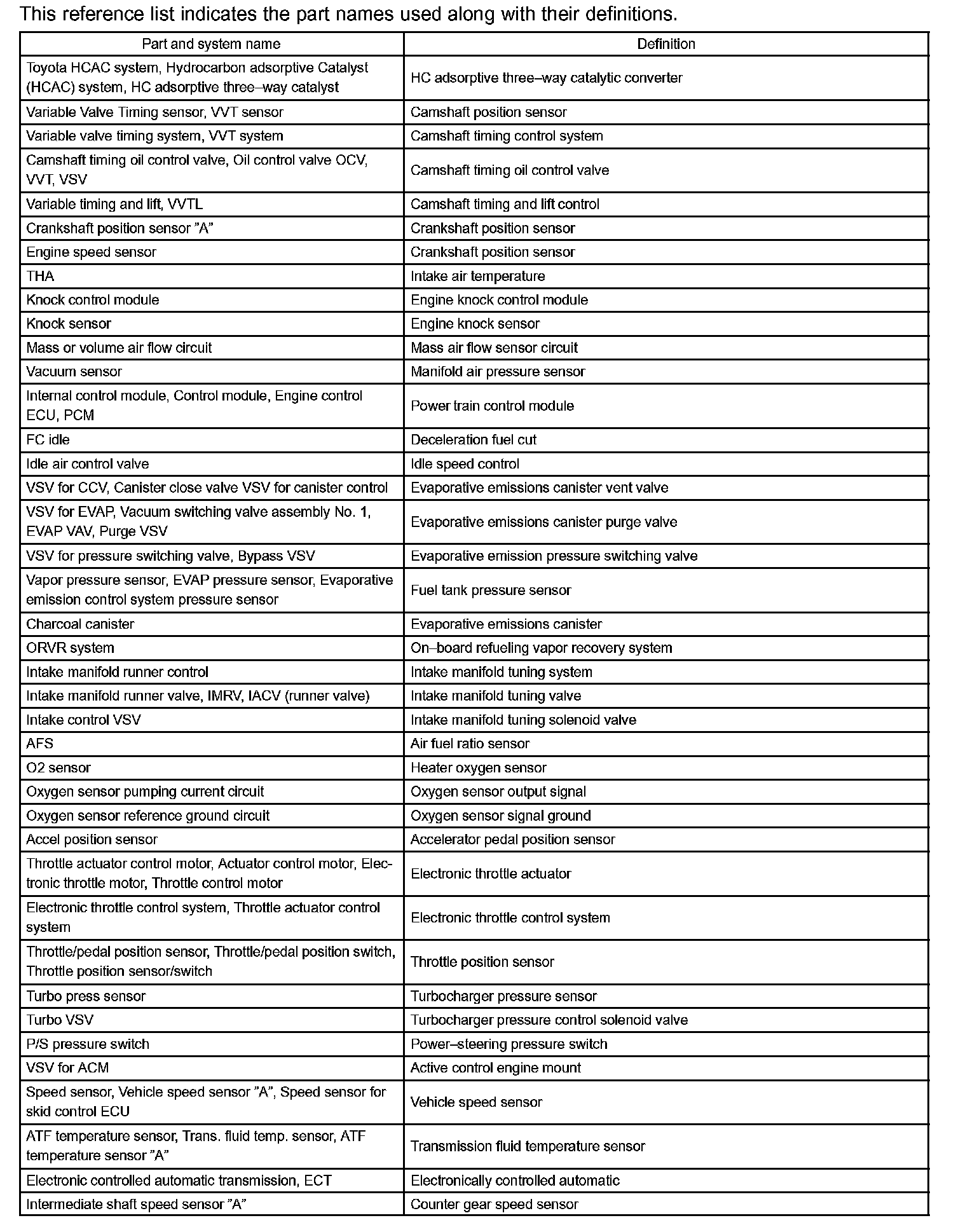 Toyota Part And System Name List Part 1:
