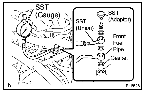 d. Install the front fuel pipe and SST (pressure gauge. to the delivery pipe with the 3 lower gaskets and SST (adaptor).