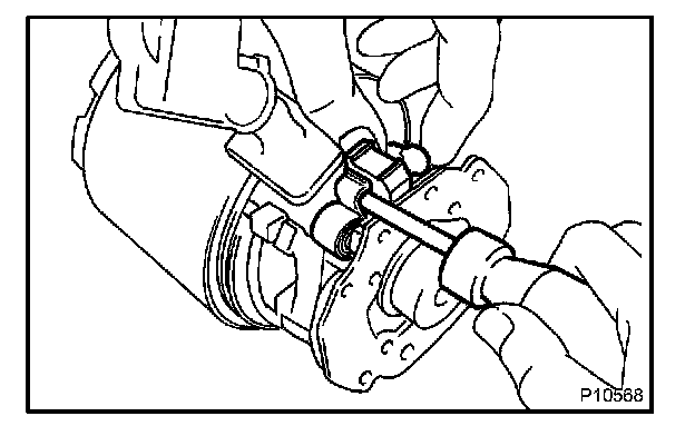 c. Using a screwdriver, hold the spring back and disconnect the brush from the brush holder. Disconnect the 4 brushes, and remove the brush holder.