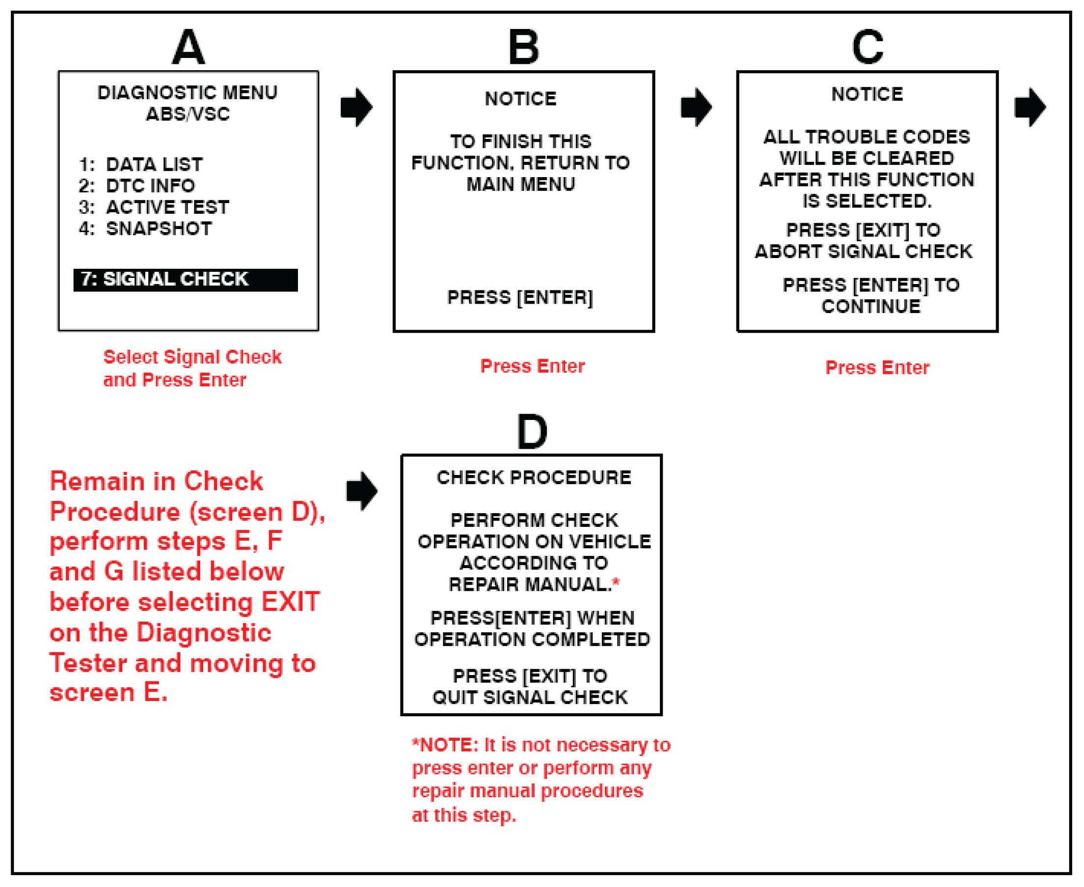 D. Place the Diagnostic Tester into Signal Check mode under the ABS/VSC menu.