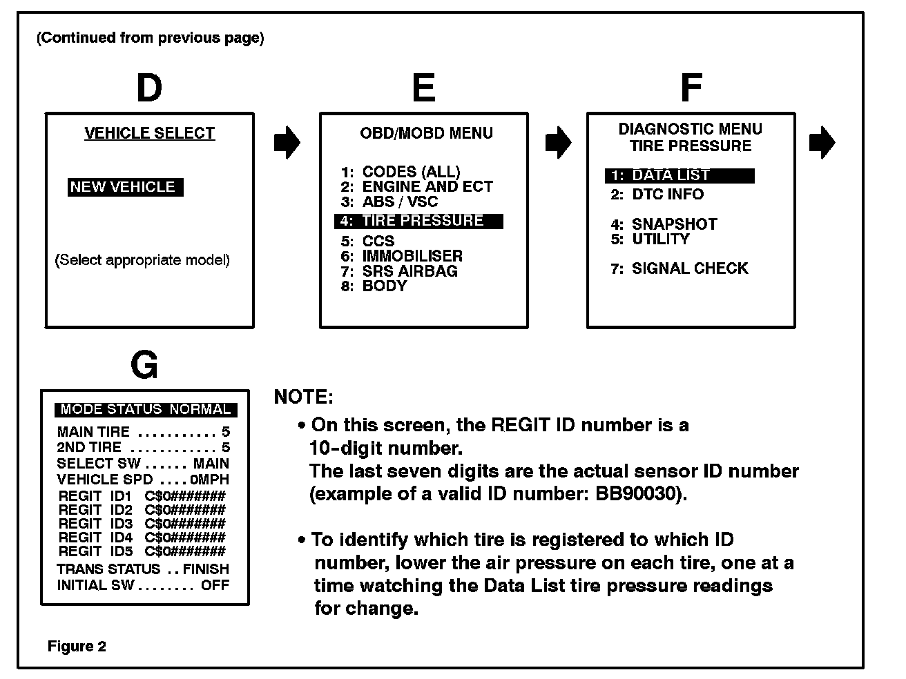 On screen "G" above, record the sensor ID numbers listed in the REGIT ID 1 - 5 so they can be manually re-recorded during the registration process. The sensor ID numbers listed in the Data List REGIT ID 1 - 5 are the actual sensor ID numbers registered in the TPWS ECU (these sensor ID numbers may or may not be the correct sensor ID numbers for the tires currently on the vehicle).