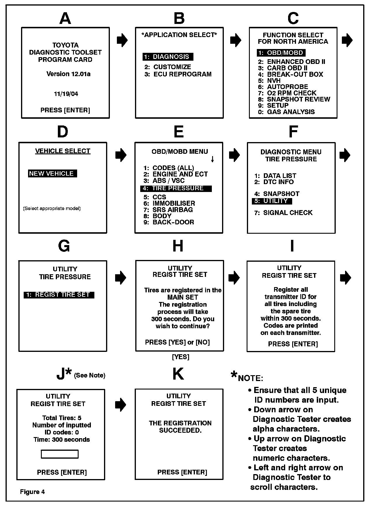 Using the Diagnostic Tester, follow the screen prints below to access and confirm the currently registered tire pressure sensor ID numbers.