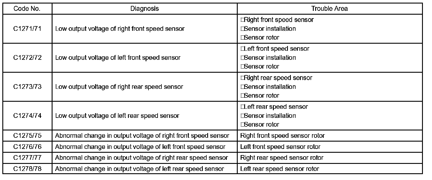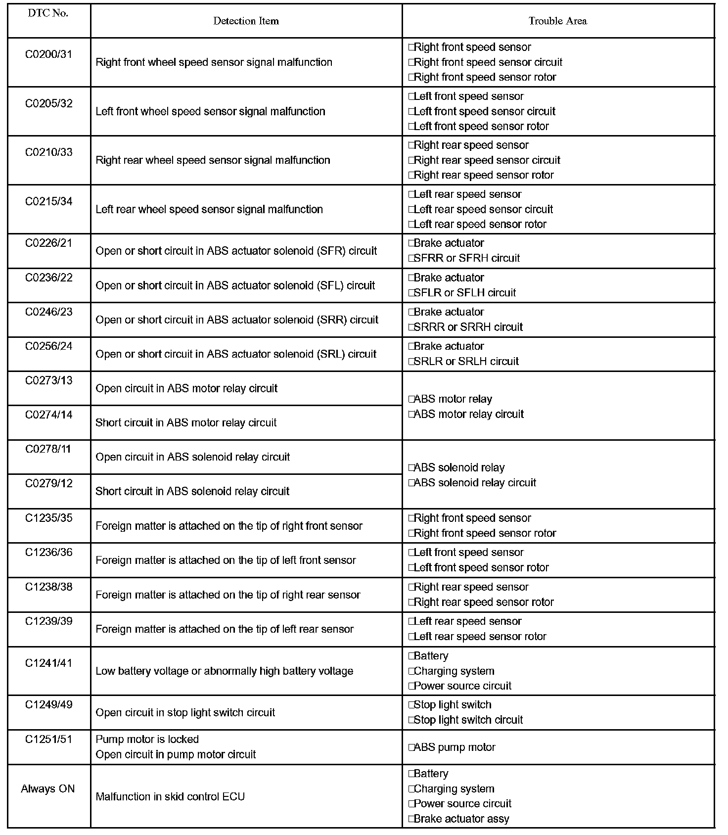 DTC chart of ABS system