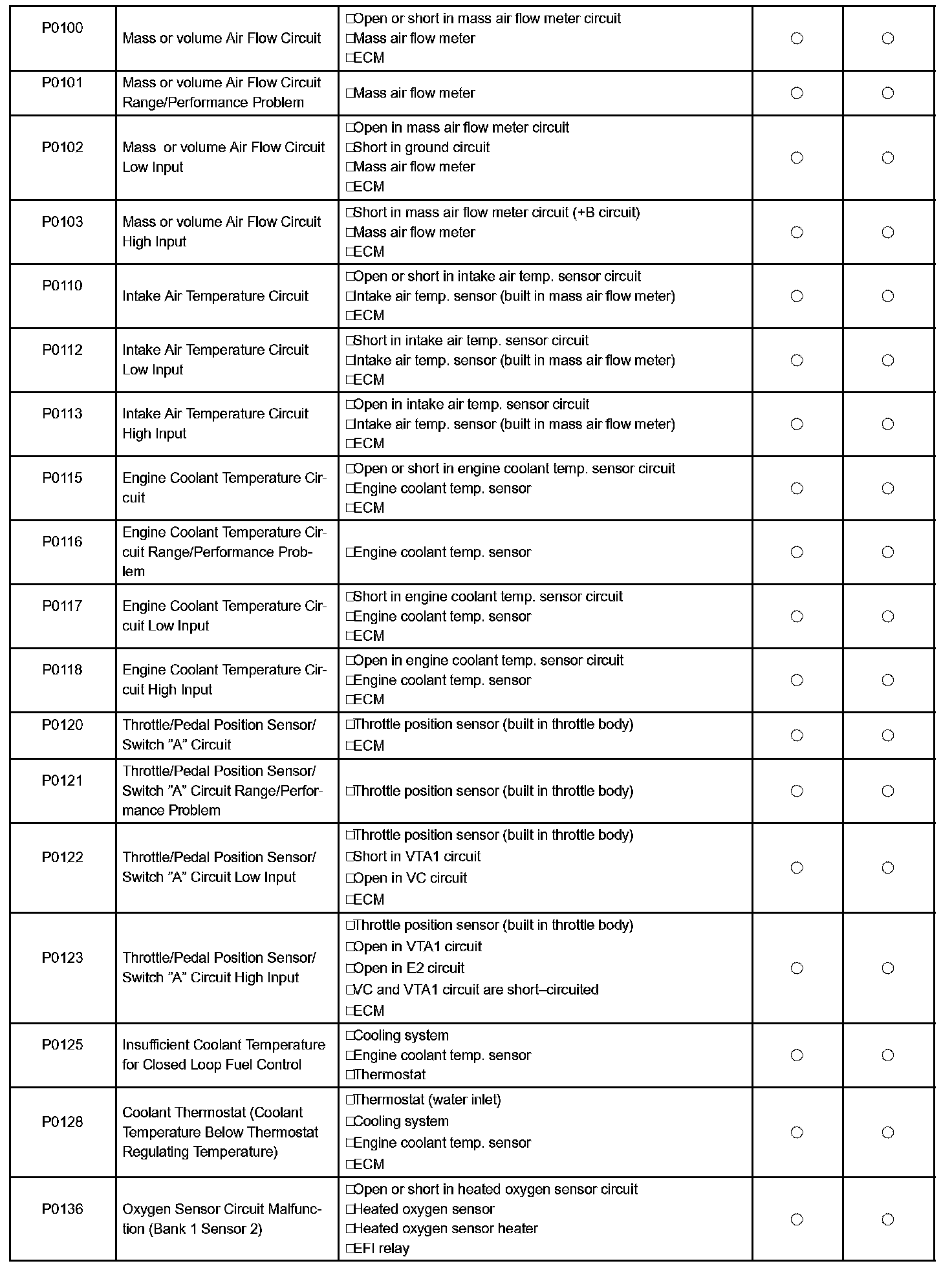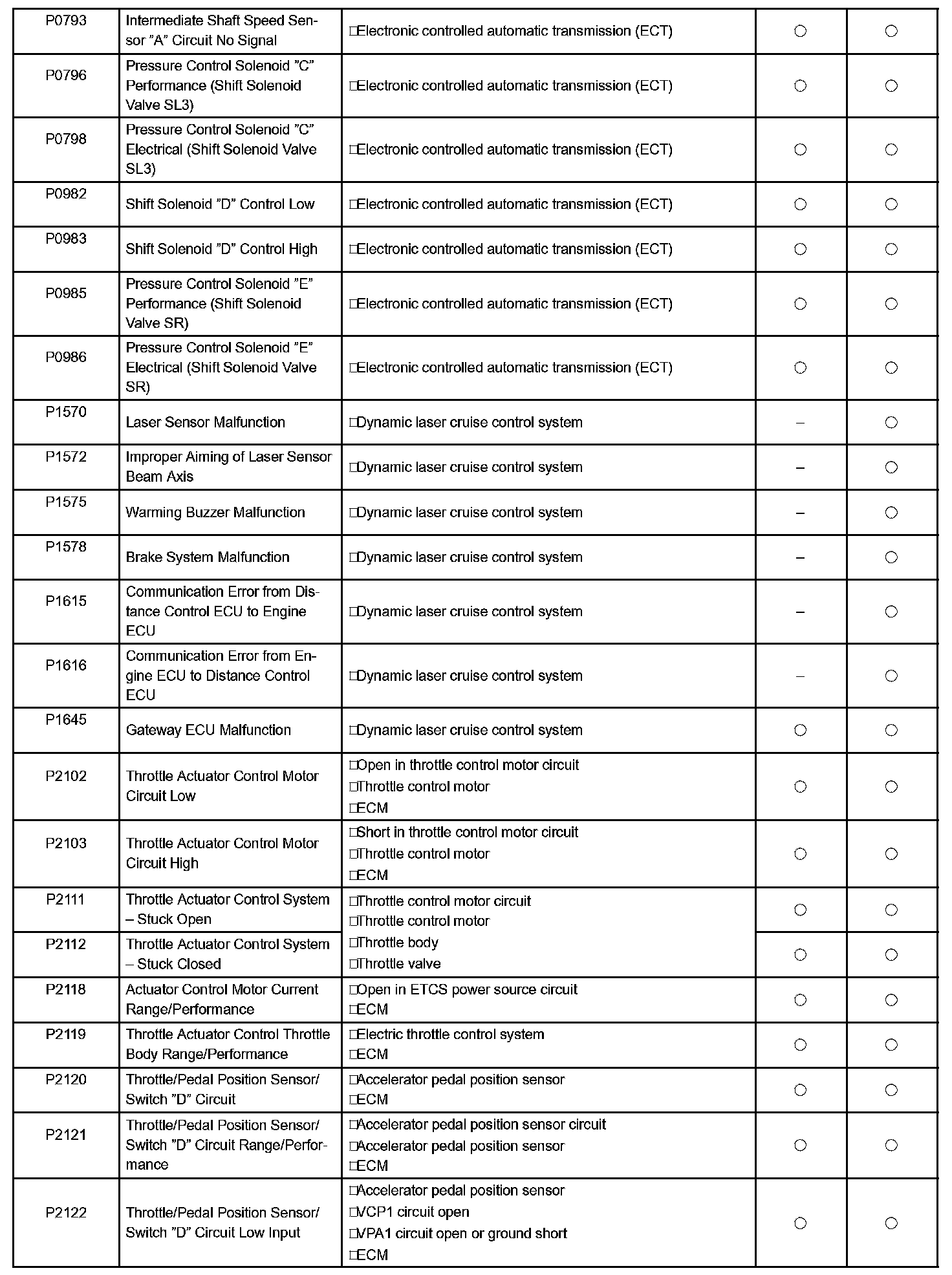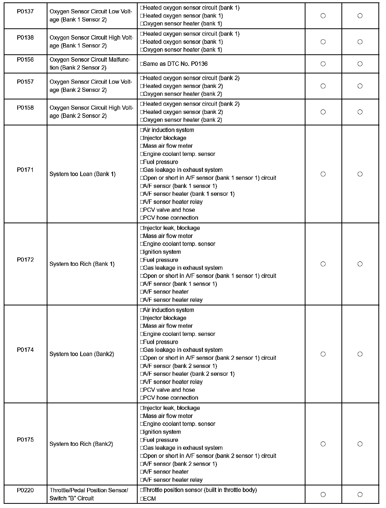 If a malfunction code is displayed during the DTC check in the check mode, check the circuit for the codes listed in the table below. For details of each code, refer to the respective "DTC No." in the DTC chart.