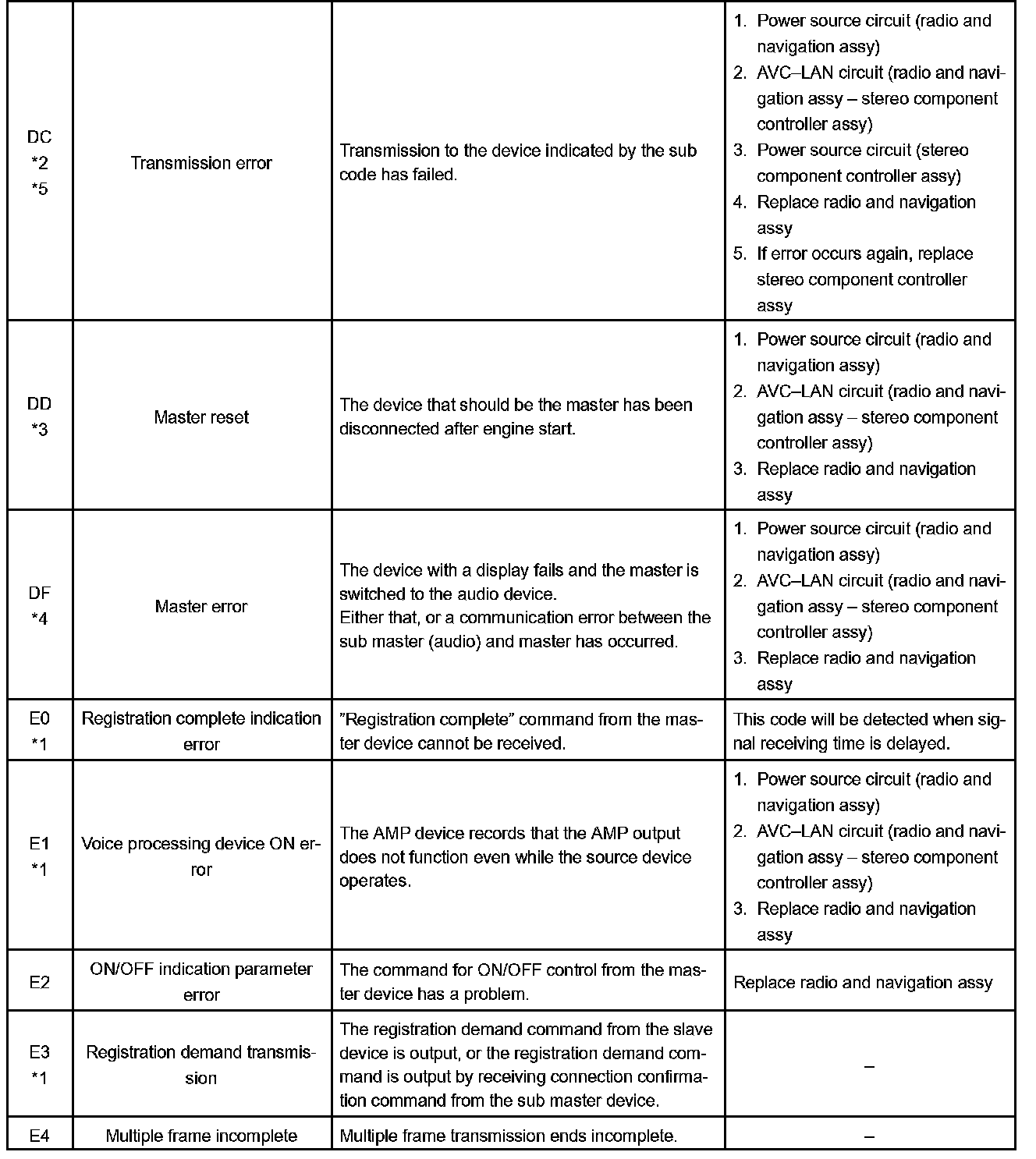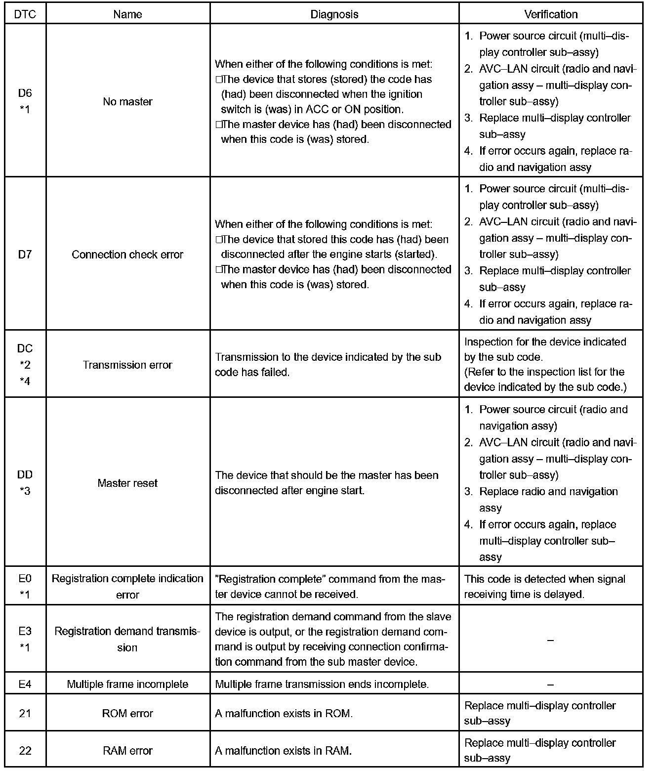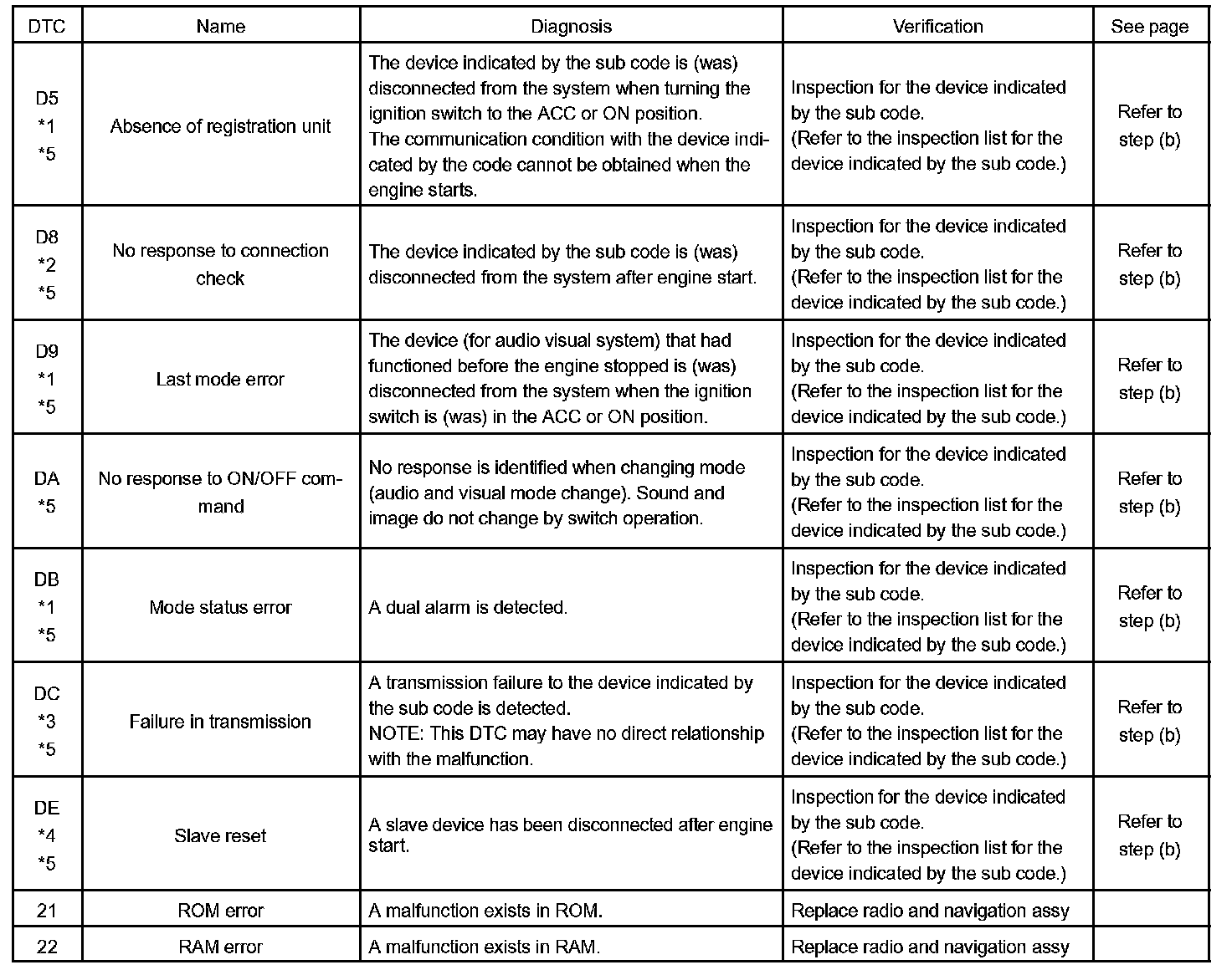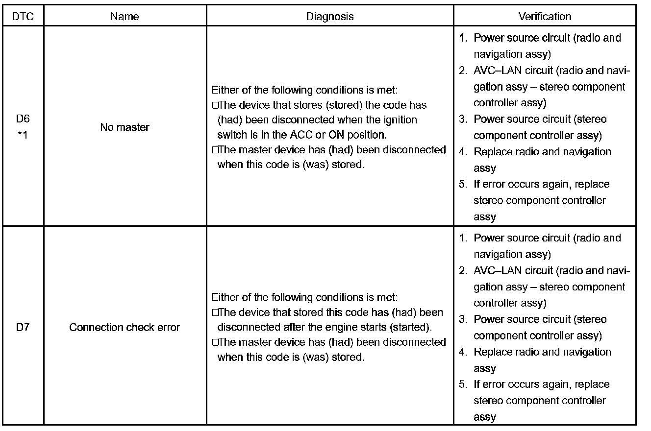 - *5: If the device is reported as not existing during verification, check the power source circuit and AVC-LAN circuit for the device.