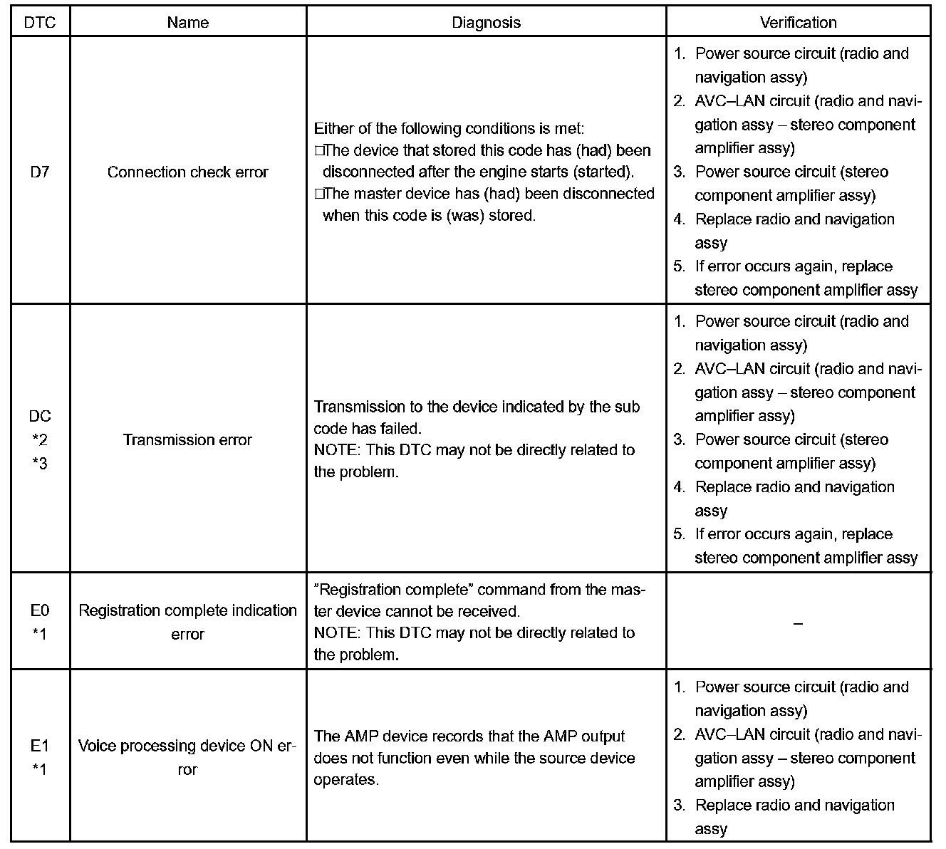 - *3: If the device is reported as not existing during verification, check the power source circuit and AVC-LAN circuit for the device.