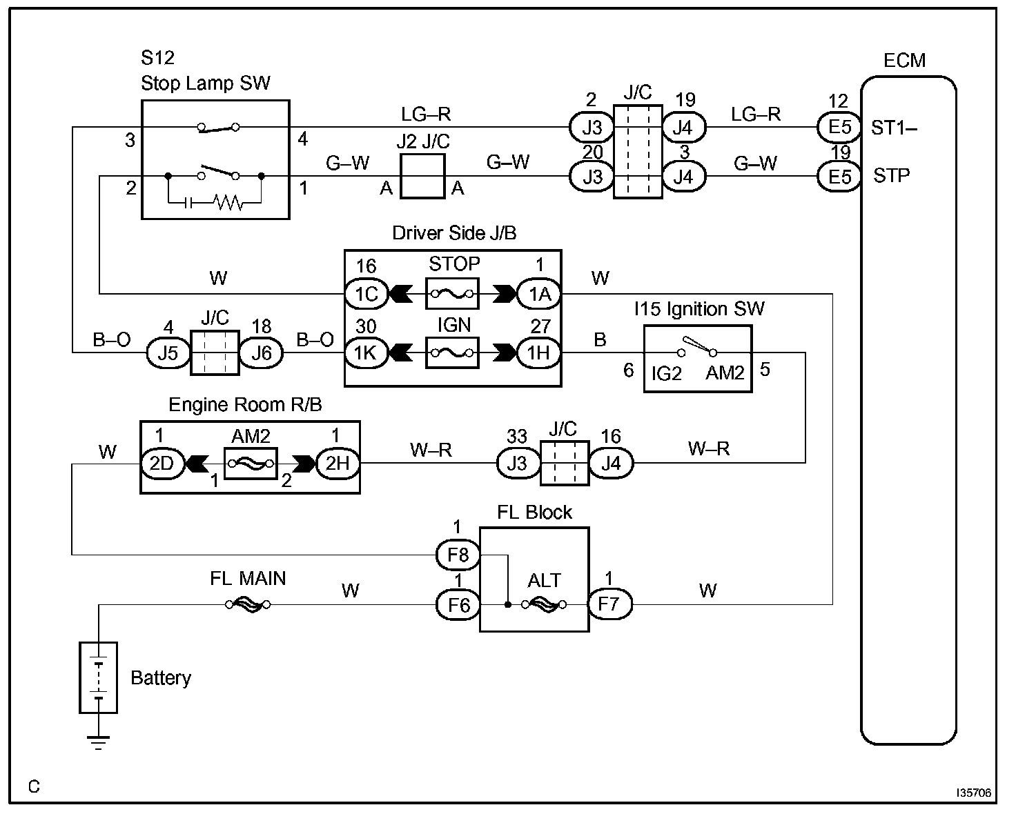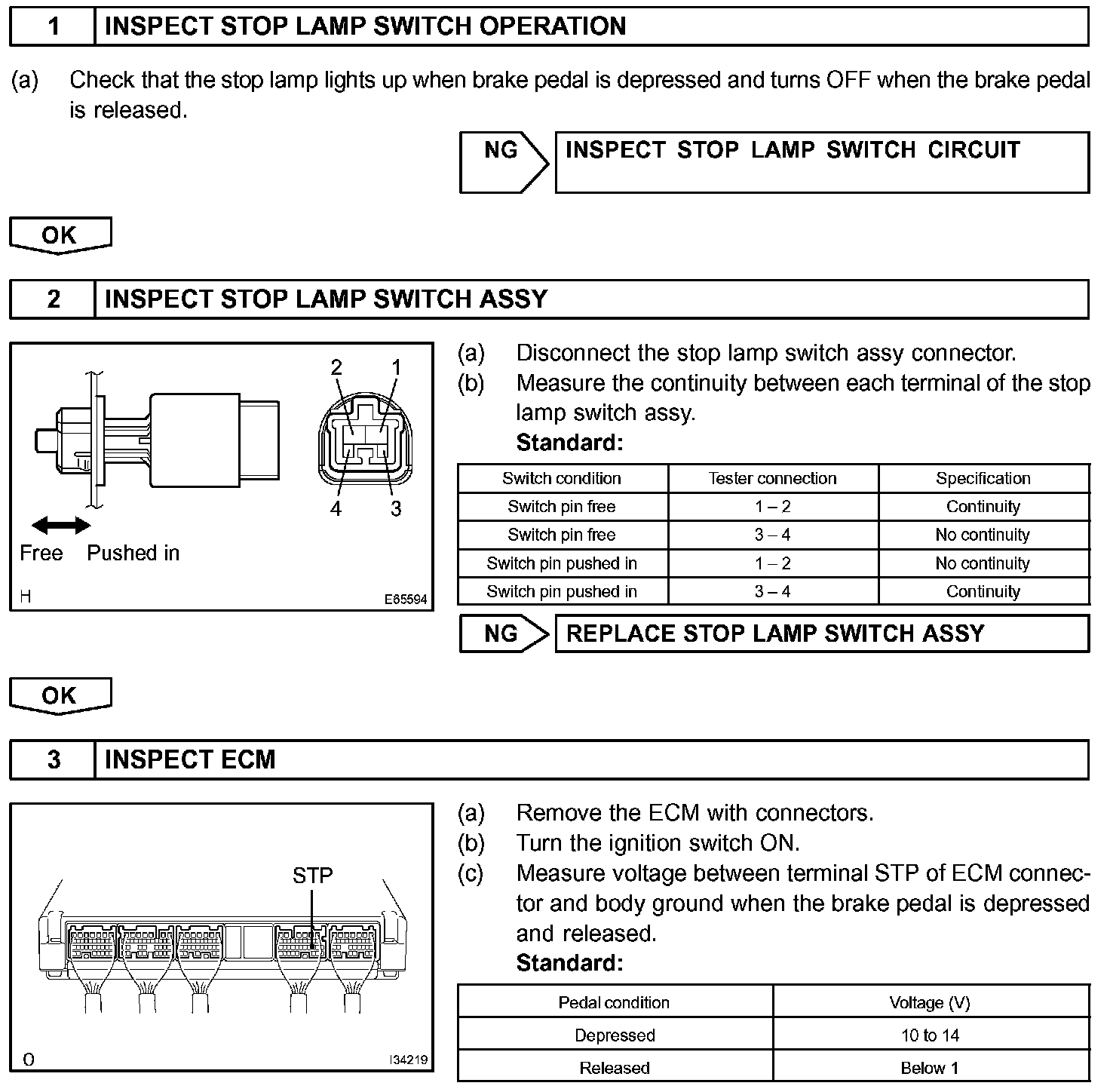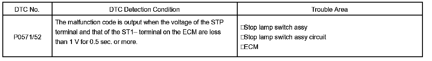 When the brake is on, battery positive voltage is normally applied through the STOP fuse and the stop lamp switch assy to terminal STP of the ECM, and the ECM turns the cruise control OFF.