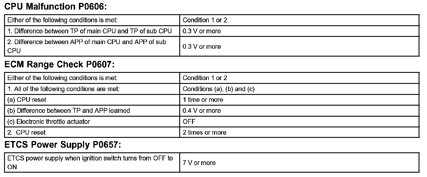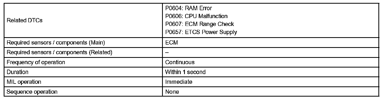 The ECM memory status is diagnosed by internal "mirroring" of the main CPU and the sub CPU to detect Random Access Memory (RAM) errors. The two CPUs also perform continuous mutual monitoring. The ECM sets a DTC if: 1) outputs from the 2 CPUs are different and deviate from the standards, 2) the signals to the throttle actuator deviate from the standards, 3) a malfunction is found in the throttle actuator supply voltage, and 4) any other ECM malfunction is found.