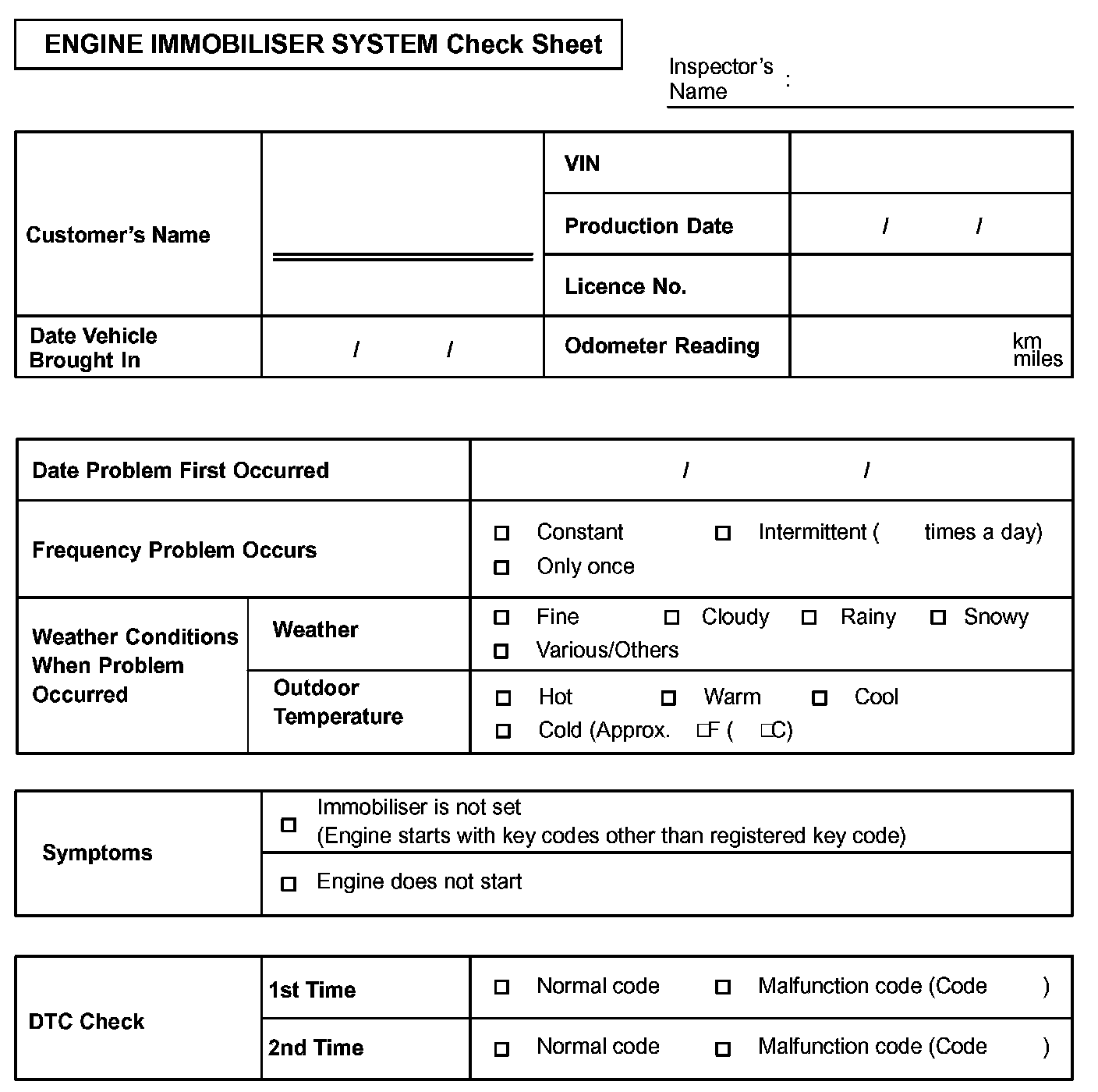 Engine Immobiliser System Check Sheet: