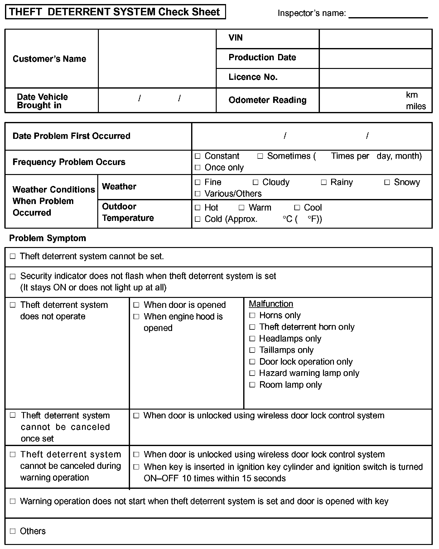 Theft Deterrent System Check Sheet: