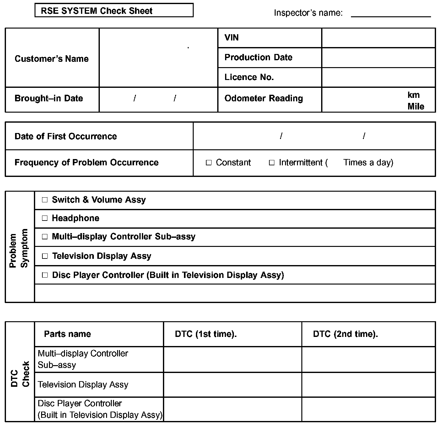 RSE System Check Sheet: