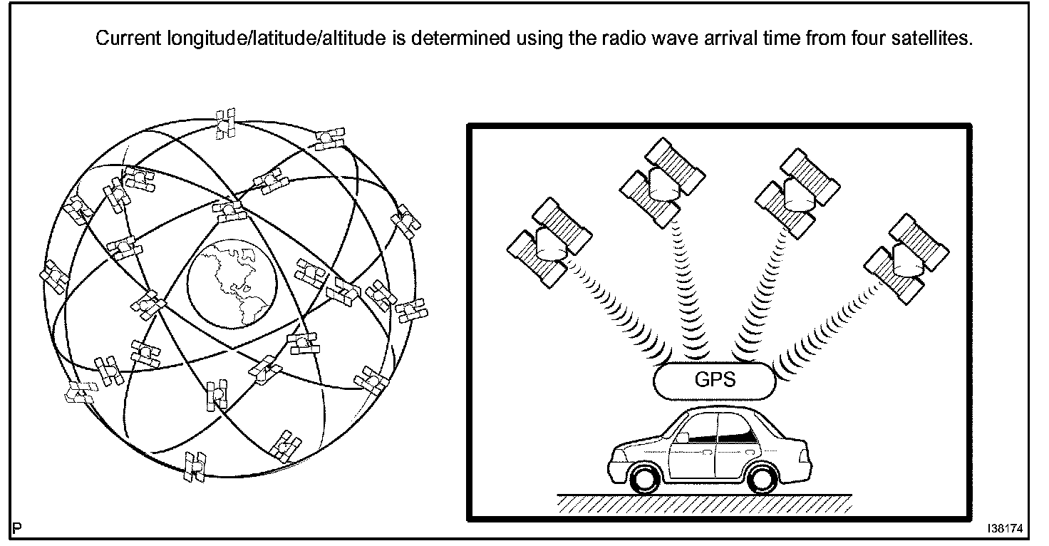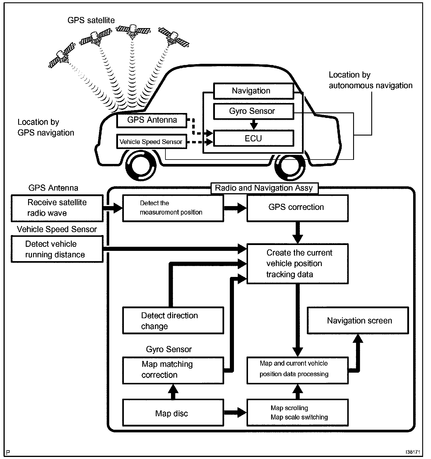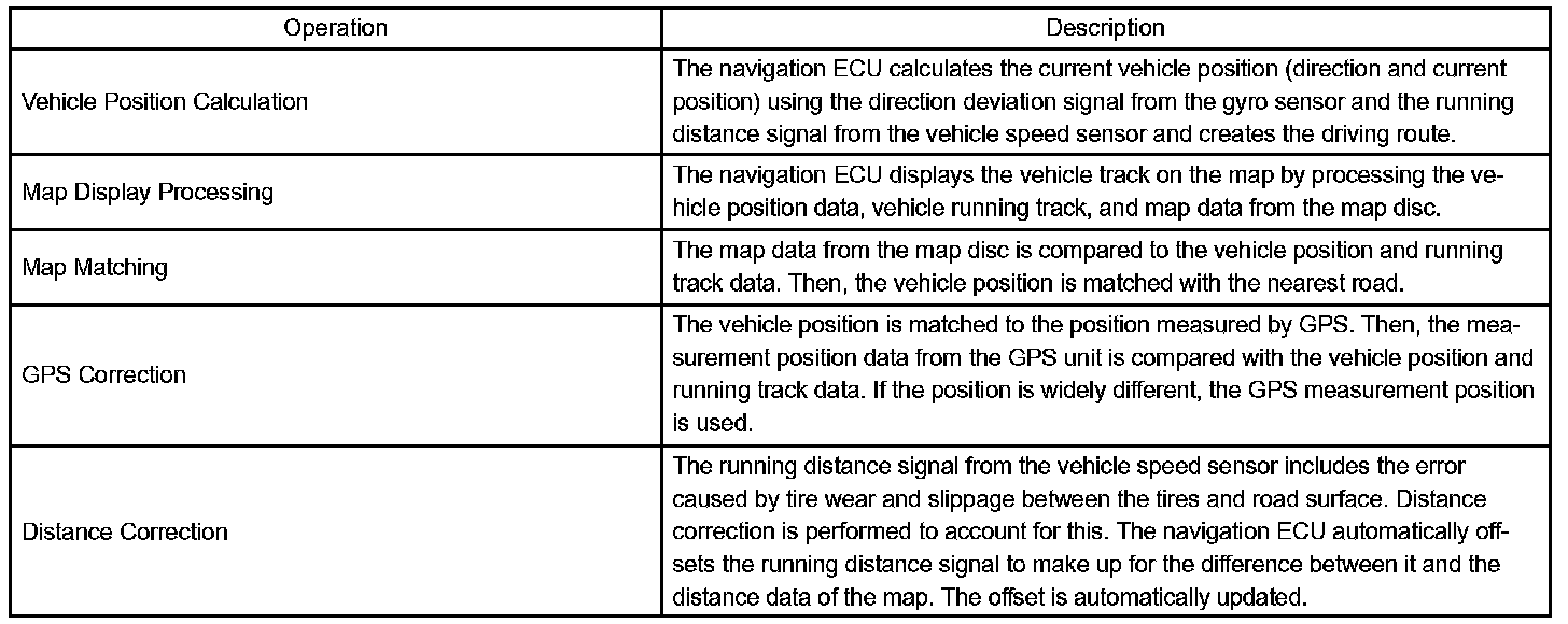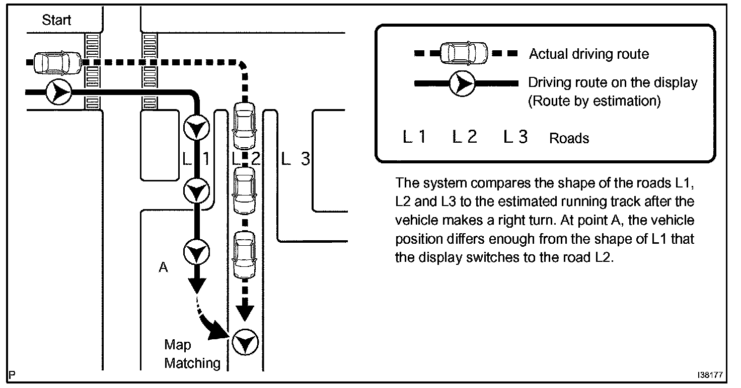 The current driving route is calculated by autonomous navigation (according to the gyro sensor and vehicle speed sensor) and GPS navigation. This information is then compared with possible road shapes from the map data in the map disc and the vehicle position is set onto the most appropriate road.