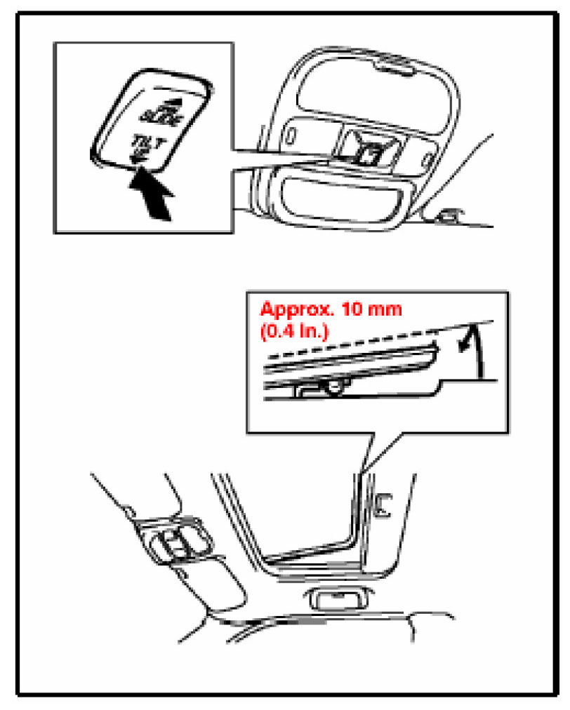 1. Push and hold the "TILT UP" side of the switch until the Moon Roof tilts all the way up and then tilts down slightly (approximately 10 mm [0.4 in.] at rear end).