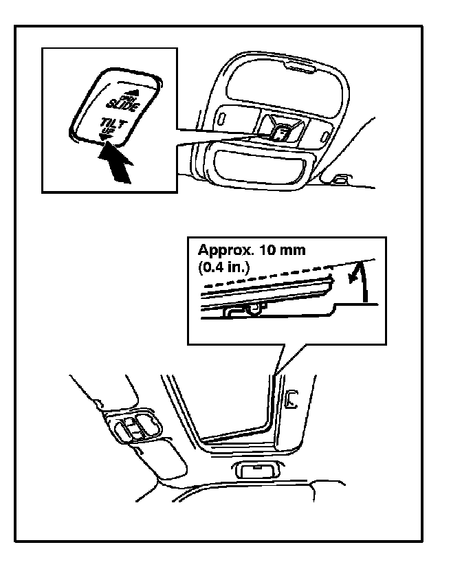 1. Push and hold the "TILT UP" side of the switch until the Moon Roof tilts all the way up and then tilts down slightly (approximately 10 mm [0.4 in.] at rear end).