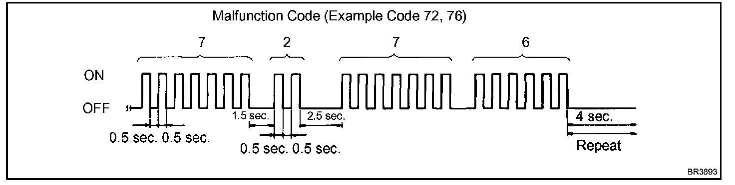 - If every sensor is normal, a normal code is output (A cycle of 0.25 sec. ON and 0.25 sec. OFF is repeated).