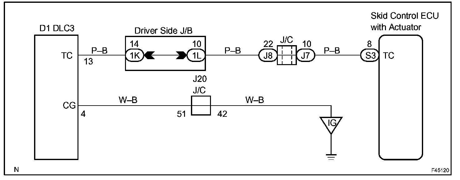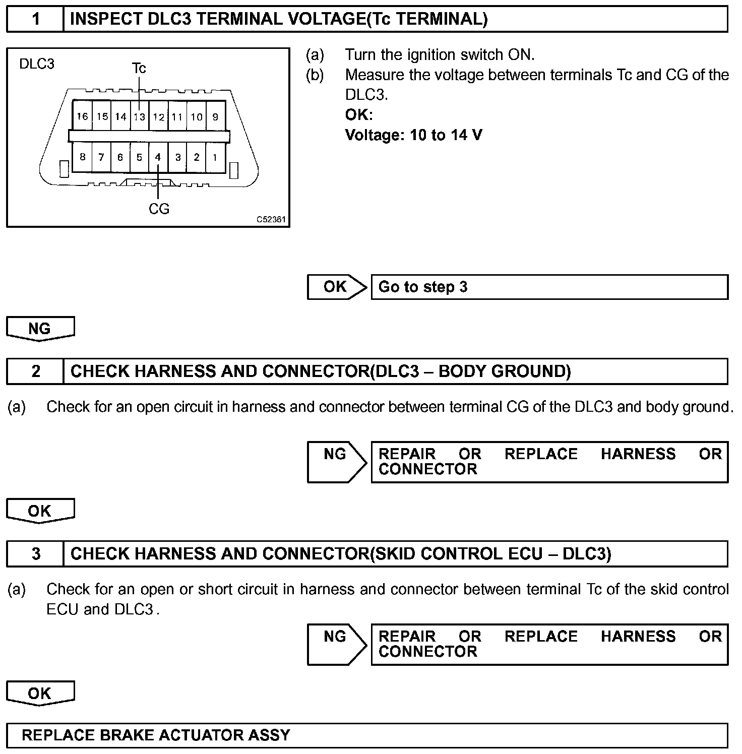 Connecting terminals Tc and CG of the DLC3 causes the ECU to display the DTC by flashing the ABS warning light.