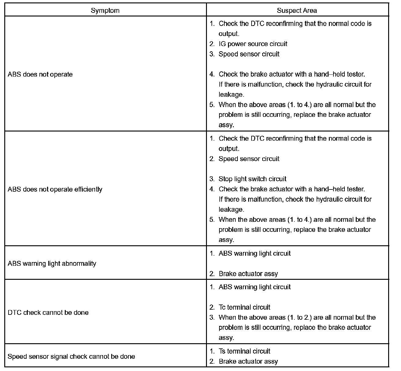 If a normal code is displayed during the DTC check but the problem still occurs, check the circuits for each problem symptom in the order given in the table and proceed to the relevant troubleshooting.