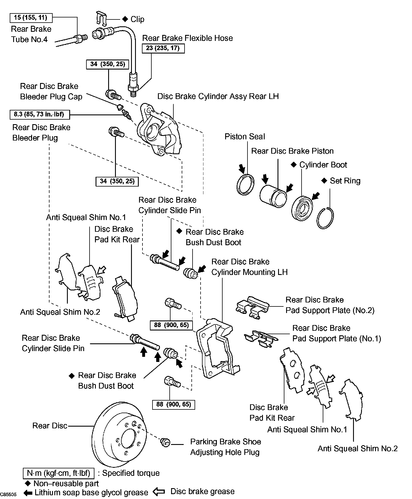 a. Apply lithium soap base glycol grease to the rear disc brake piston and new cylinder boot.