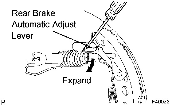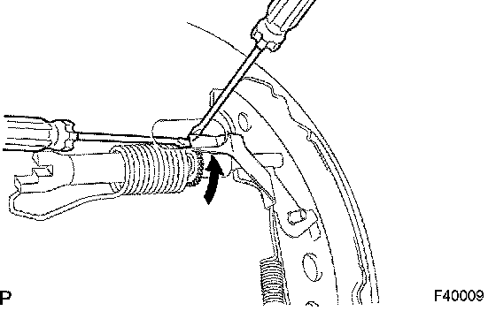 c. Using another screwdriver, reduce the brake shoe adjuster by turning the adjusting wheel.