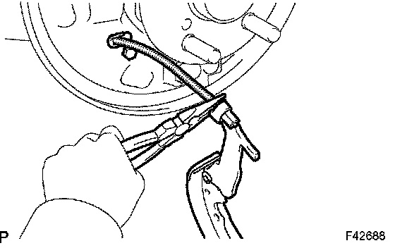 b. Using a needle-nose pliers, disconnect the parking brake cable No.3 and remove the rear brake shoe.