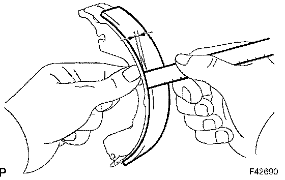 If the lining thickness is at the minimum thickness or less, or if there is severe, uneven wear, replace the brake shoe.