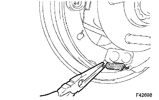 e. Remove the tension spring and front brake shoe. Remove the automatic adjust lever spring and rear brake automatic adjust lever LH from the front brake shoe.