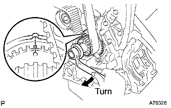 2. Turn the crankshaft clockwise, and align the timing marks of the crankshaft timing pulley and the oil pump body.