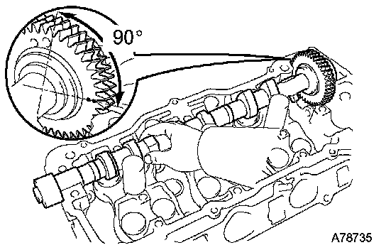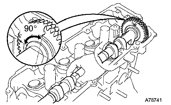 b. Place the No. 2 camshaft at a 90° angle of the timing mark (2 dot marks) on the cylinder head.