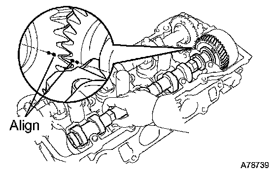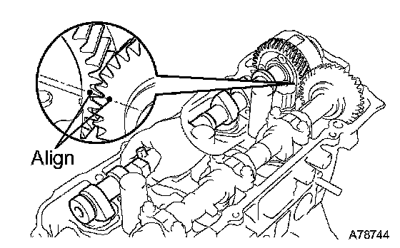 b. Align the timing marks (2 dot marks) of the camshaft drive with the driven gears.