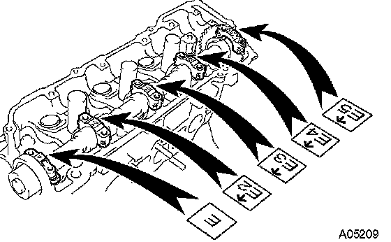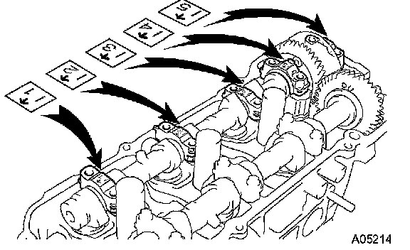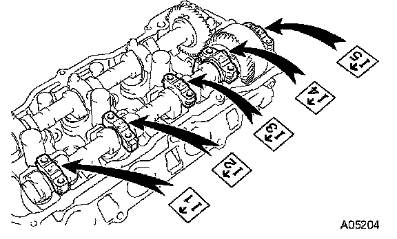 NOTICE: Since the thrust clearance of the camshaft is small, the camshaft must be kept level while it is being removed. If the camshaft is not kept level, damage to the cylinder head or to the camshaft may result. To avoid this, the following steps should be carried out.