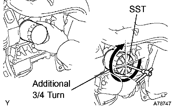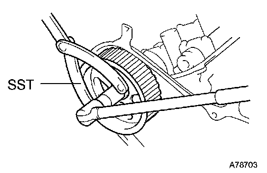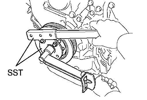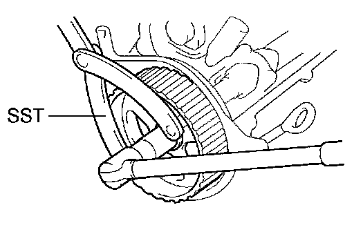 f. Using SST, turn the crankshaft pulley, and align the timing marks of the timing pulley and the No. 3 timing belt cover.