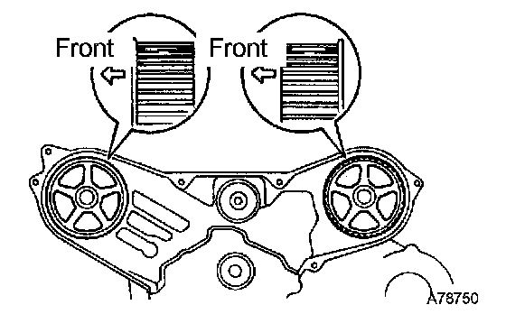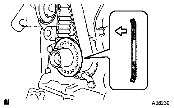^ Face the belt guide of the RH timing pulley toward front of the engine.