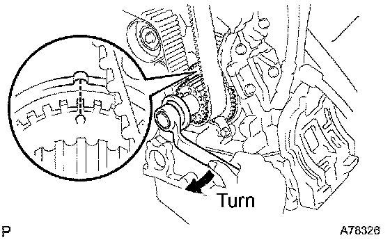 g. Turn the crankshaft, and align the timing marks of the crankshaft timing pulley and the oil pump body.