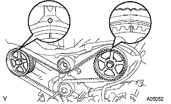 j. Align the installation marks on the timing belt with the timing marks of the camshaft timing pulleys.