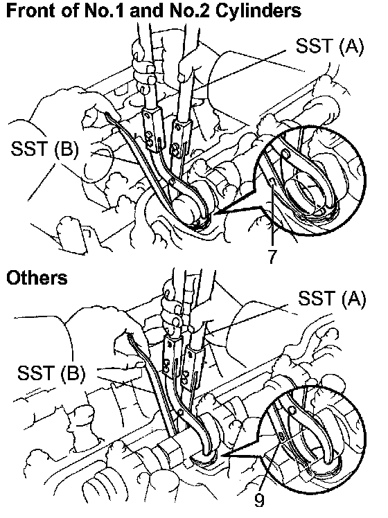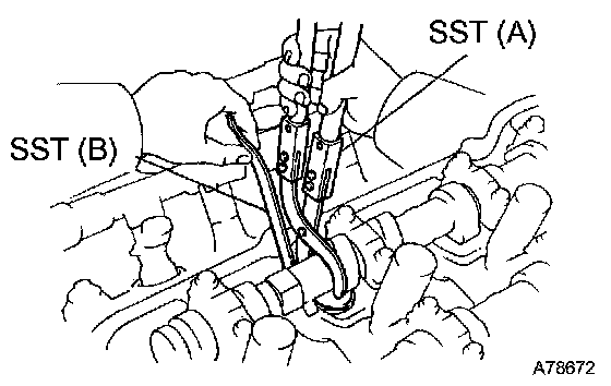 c. Using SST (A), press down the valve lifter and place SST (B) between the camshaft and valve lifter. Remove SST (A).