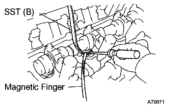 i. Press down the valve lifter with SST (A), and remove SST (B).