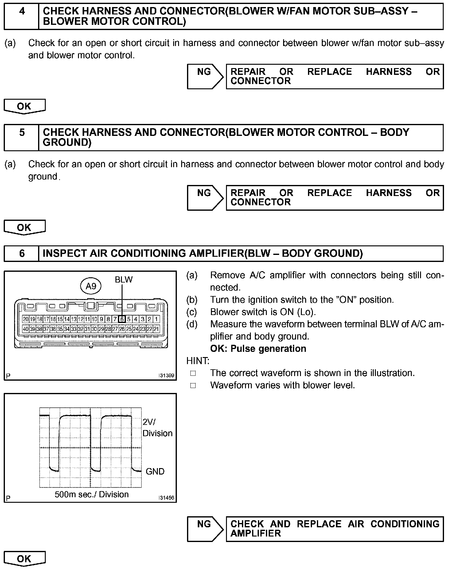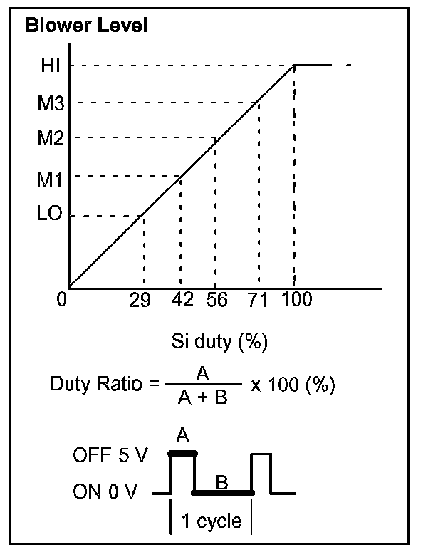 The blower motor is operated by signals from the A/C amplifier. Blower motor speed signals are transmitted by changes in the Duty Ratio.