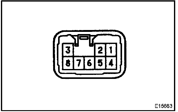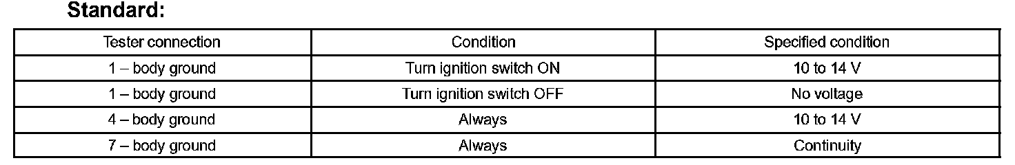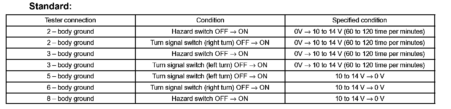 b. Connect the connector to turn the signal flasher and turn the ignition switch ON, and inspect the wire harness side connector from the back side as shown in the chart.